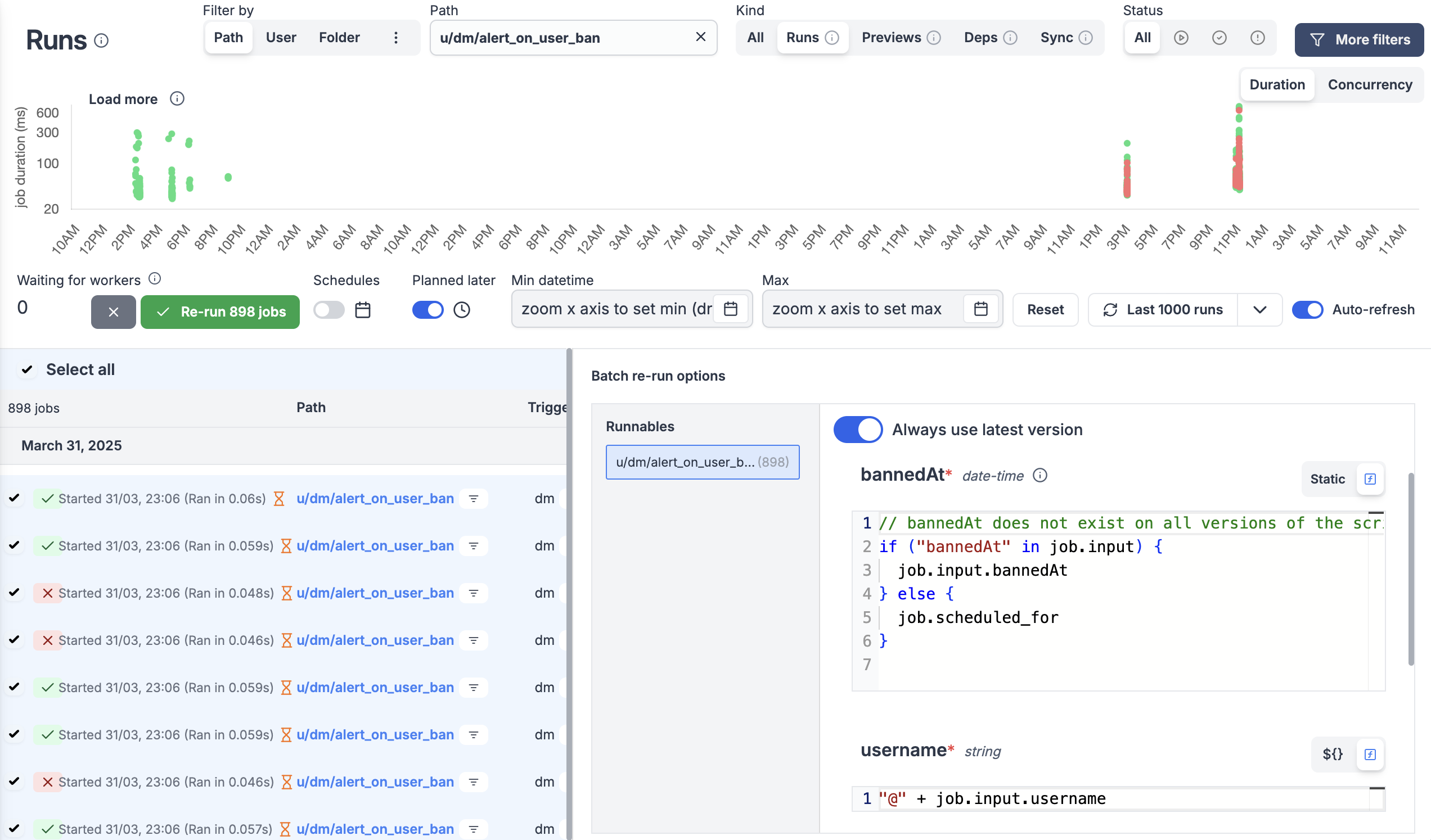 - Volumes: persistent file storage attached to scripts via comment annotations, synced to workspace object storage.